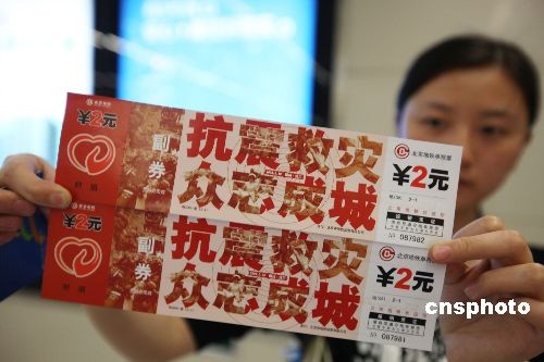 5月18日,北京地鐵首次發(fā)行的“特種”愛心附捐車票出現(xiàn)在北京地鐵所有車站售票臺(tái),這套附帶為地震災(zāi)區(qū)捐款獻(xiàn)愛心的文化車票受到了市民的青睞,北京地鐵公司將把附捐的40萬元愛心款全部轉(zhuǎn)交中國紅十字會(huì)。這套愛心附捐車票發(fā)行總量為10萬套,每張車票售價(jià)4元,其中包括2元捐給災(zāi)區(qū)的款項(xiàng)。中新社發(fā) 老羅 攝