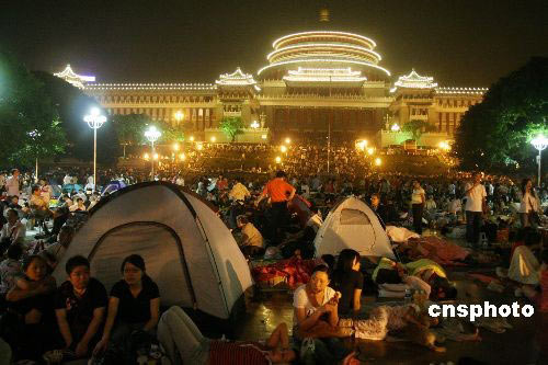 5月20日凌晨,重慶人民廣場內(nèi),大批當?shù)厥忻裨诖舜罱◣づ襁^夜。19日晚21時30分許,重慶市人民政府發(fā)布信息稱,19日至20日,在汶川震區(qū)附近有可能發(fā)生6至7級余震,重慶各地將會有明顯震感。并提醒廣大市民注意安全,按防震知識做好防范工作,注意相互幫助、維護公共秩序。信息發(fā)布后,大批當?shù)厥忻耖_始聚集廣場、平地等開闊地帶過夜。中新社發(fā) 郭晉嘉 攝