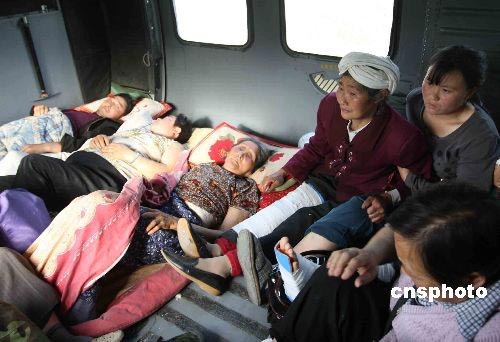 5月19日,鐵軍官兵翻山越嶺6個(gè)多小時(shí)到達(dá)阿壩藏族羌族自治州三江鄉(xiāng),將包括10名藏族災(zāi)民在內(nèi)的15名重傷員利用直升機(jī)運(yùn)往成都進(jìn)行救治。中新社發(fā) 曾憲平 攝