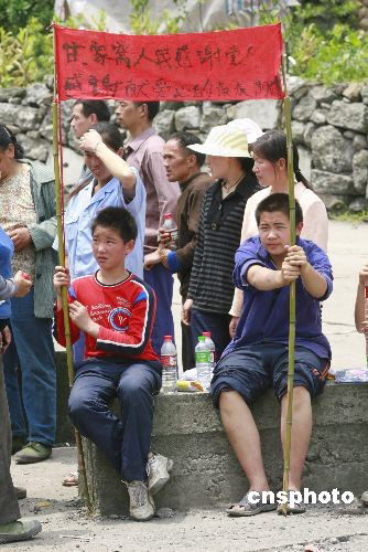 圖:四川什邡災(zāi)區(qū)兒童手舉標語謝恩人