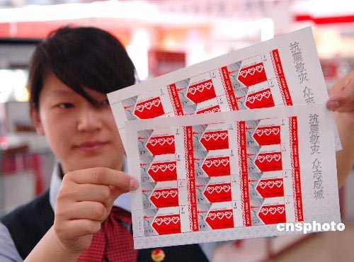2008年5月20日,濟(jì)南市郵政局趵突泉郵電支局員工展示《抗震救災(zāi) 眾志成城》賑災(zāi)郵票。為進(jìn)一步向地震災(zāi)區(qū)提供社會援助,當(dāng)日,中國郵政特別發(fā)行《抗震救災(zāi) 眾志成城》賑災(zāi)附捐郵票一套一枚,售價2.20元,其中郵票面值1.20元,附捐金額1元。該套郵票采用主、附票形式,畫面表現(xiàn)了全國各族人民在嚴(yán)重的地震災(zāi)害面前手拉手、心連心,眾志成城的堅定意志和無私奉獻(xiàn)精神。據(jù)了解,為了表達(dá)全體郵政員工對地震災(zāi)區(qū)人民的情誼,中國郵政集團(tuán)公司決定將此套郵票的全部郵資收入1560萬元和附捐款1300萬元,共計2860萬元通過民政部門捐贈地震災(zāi)區(qū)。中新社發(fā) 崔鵬森 攝