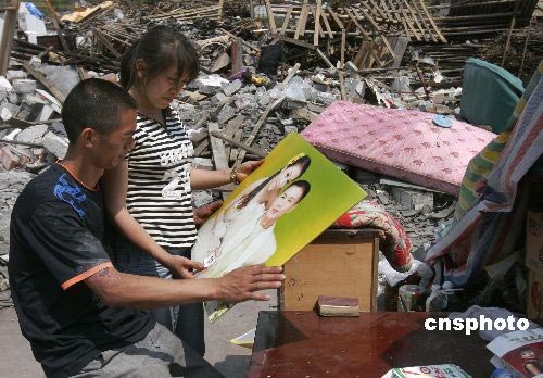 5月19日,四川省什邡市鎣華鎮(zhèn)仁和村三組梁正彬一家正在從廢墟中扒尋自家物品。他們很幸運(yùn),災(zāi)難發(fā)生時(shí),包括老父母和年幼女兒在內(nèi)的全家5口人都跑出了轟然倒塌的房屋。“平安就是福!”他們默默收拾殘屋,準(zhǔn)備重建家園。中新社發(fā) 張曉理 攝