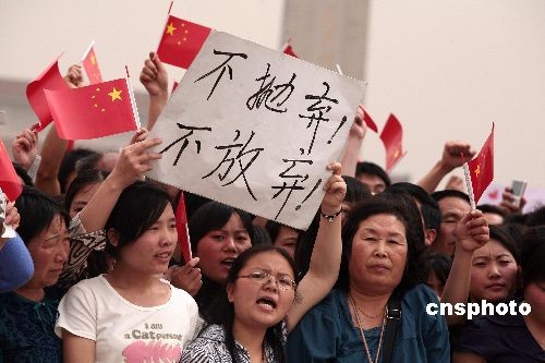 圖:民眾在天安門(mén)廣場(chǎng)為四川加油