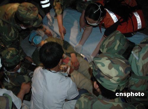 5月20日凌晨4時(shí),在云南駐滇某部劉清泉副師長等百名戰(zhàn)士護(hù)送下,被埋172小時(shí)的安縣雎水道禧村六組的礦工彭國華成功獲救,創(chuàng)造了生命的奇跡。中新社發(fā) 王荔 周保全 攝