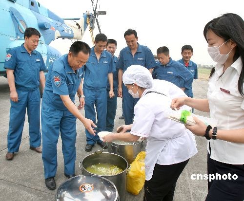 5月20日,成都市某企業(yè)職工給戰(zhàn)斗在抗震救災(zāi)一線的南空某團(tuán)官兵送在熱氣騰騰的老鴨湯。
