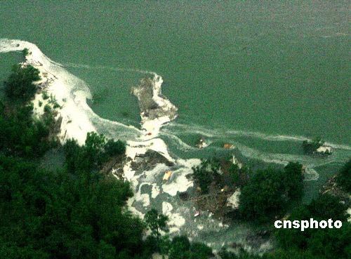 五月二十日,北川重災(zāi)區(qū)的“定時(shí)炸彈”--堰塞湖水位上漲危急萬分。一座大山的崩塌堵塞河道形成危險(xiǎn)的堰塞湖,如果潰堤將淹沒下游北川全縣和綿陽災(zāi)區(qū)。目前蓄水已經(jīng)淹沒了上游的一些鄉(xiāng)村。中新社發(fā) 賈國榮 攝