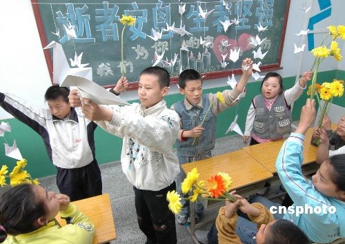 5月21日是全國(guó)哀悼日最后一天,遼寧省錦州市古塔區(qū)培智學(xué)校的300名智障小學(xué)生用雙手疊制了1000只紙鶴,還買來(lái)黃菊花悼念地震逝去的小朋友,放飛心愿,為災(zāi)區(qū)人民祈福。中新社發(fā) 李鐵成jz 攝