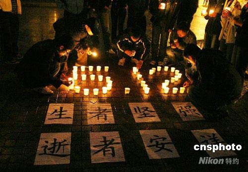 5月21日晚上,沈陽市下起了大雨,但大雨沒有擋住市民哀悼的心情,大家自發(fā)的來到沈陽市政府廣場用燭光等形式哀悼四川汶川地震遇難同胞并高呼“汶川加油,四川雄起,中國加油”等口號。中新社發(fā) 黃金昆 攝