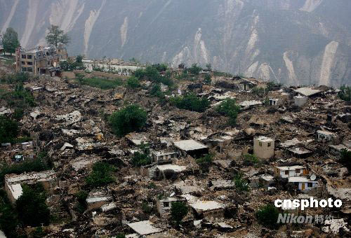 5月22日是汶川大地震第十一天,空中鳥瞰汶川縣城十余公里外的一座羌族山寨震后變?yōu)閺U墟,令人慘不忍睹。 中新社發(fā) 賈國榮 攝