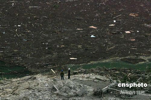 汶川大地震發(fā)生以后,水利地質(zhì)人員乘直升飛機降落到北川唐家山堰塞湖,檢測水位上漲和污染危情,嚴密監(jiān)測由于一座大山的崩塌堵塞河道形成的堰塞湖。中新社發(fā) 賈國榮 攝