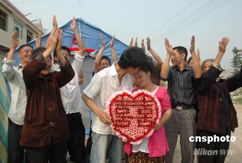 5月22日,在汶川大地震重災(zāi)區(qū)——四川安縣黃土鎮(zhèn)馬村境內(nèi)的臨時災(zāi)民救助點(diǎn)里,新郎肖建平與新娘熊招鄰舉行了帳篷婚禮。災(zāi)難會帶給人們創(chuàng)傷,但是無法磨滅人們對美好生活的向往。中新社發(fā) 涂萍 攝