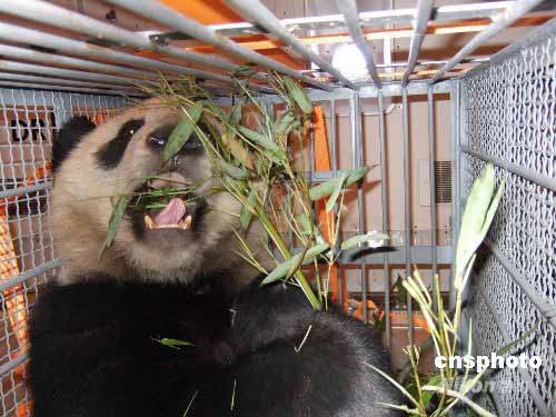 5月24日,8只奧運(yùn)大熊貓“獨(dú)享”世界最大最先進(jìn)貨機(jī)進(jìn)京。這次運(yùn)送奧運(yùn)熊貓的專機(jī),是南航完成運(yùn)送救災(zāi)物資任務(wù)后,安排的目前世界上最大、最先進(jìn)的波音747-400F型貨機(jī)。這架飛機(jī)內(nèi)外將進(jìn)行全面的清洗和消毒,為大熊貓配備純凈水和新鮮嫩竹葉等機(jī)上美食。貨機(jī)主艙溫度控制在8℃至14℃,使大熊貓?jiān)跈C(jī)艙內(nèi)依然能感受到與四川臥龍保護(hù)區(qū)一樣的溫度。圖為進(jìn)京大熊貓?jiān)诤銣貙C(jī)上用餐。中新社發(fā) 林宇定 攝