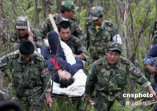 5月24日,駐豫某紅軍師、號稱“鐵軍”的葉挺獨立團(tuán)22名官兵渡岷江、翻大山,將大山深處的四川省汶川縣旋口鎮(zhèn)黃家村3名在地震中受傷骨折的村民或用簡易擔(dān)架,或輪流背負(fù),歷經(jīng)9小時轉(zhuǎn)移到安全地區(qū),并及時送往都江堰醫(yī)治。中新社發(fā) 張曉理 攝
