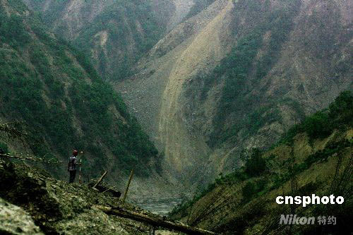 圖:科技人員塌方中測(cè)量唐家山堰塞湖