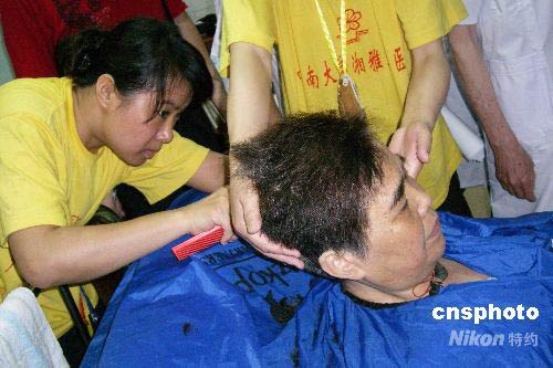 5月27日,湖南青年志愿者為住在湘雅二醫(yī)院的四川震區(qū)傷員理發(fā)。目前,湖南已接收四川地震災區(qū)傷員507名。中新社發(fā) 劉雙雙 攝