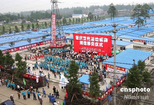 由重慶市政府捐助、南岸區(qū)承建的一萬平方米、500套輕型結構活動保暖住房5月27日在四川都江堰落成,數千都江堰受災民眾將于近日入住,成為“重慶村”一員。中新社發(fā) 趙振清 攝