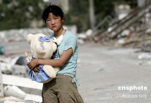 5月28日,四川平武縣南壩鎮(zhèn)的一名受災(zāi)女孩在廢墟中尋找到了自己心愛的玩具熊。平武縣在5. 12地震中損失慘重,25個(gè)鄉(xiāng)鎮(zhèn)18.6萬人全部受災(zāi)90%以上房屋全部倒塌。中新社發(fā) 杜洋 攝