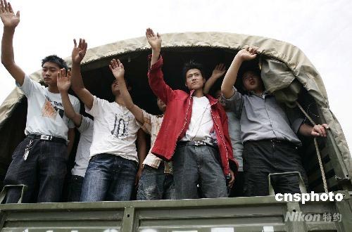 5月28日,四川平武縣南壩鎮(zhèn)19名受災(zāi)青年集體前往沈陽打工謀生自救,在搭乘軍車離開時,揮手告別家鄉(xiāng)。平武縣在5. 12地震中損失慘重,25個鄉(xiāng)鎮(zhèn)18.6萬人全部受災(zāi)90%以上房屋全部倒塌,截止27日16時,該縣3014人死亡,3555人失蹤。中新社發(fā) 杜洋 攝