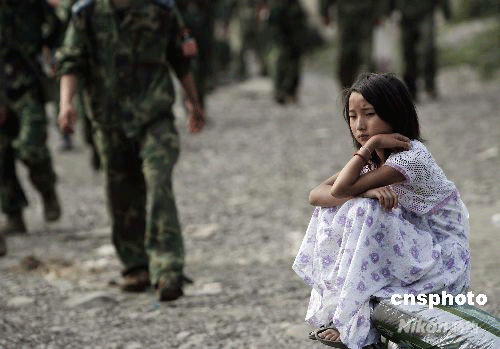 5月28日,四川平武縣南壩鎮(zhèn),一名女孩在災(zāi)后的廢墟中坐在路邊,露出了本不該在這個(gè)年齡露出的憂郁,災(zāi)難給災(zāi)區(qū)兒童帶來了巨大的心里創(chuàng)傷。平武縣在5. 12地震中損失慘重,25個(gè)鄉(xiāng)鎮(zhèn)18.6萬人全部受災(zāi),90%以上房屋倒塌,截止27日16時(shí),該縣3014人死亡,3555人失蹤。中新社發(fā) 杜洋 攝