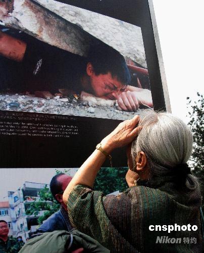 5月31日,北京王府井新華書(shū)店前,一名老人仔細(xì)觀(guān)看百名攝影家抗震救災(zāi)攝影展,一名四川省北川羌族自治縣的男子被壓在廢墟下等待救援的圖片,深深震撼了老人。此圖片是新京報(bào)記者郭鐵流5月15日在四川北川拍攝的。中新社發(fā) 鄒憲 攝