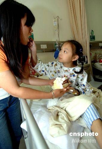 六月一日,福建省立醫(yī)院愛心病房,經(jīng)過(guò)兩次截肢的四川地震災(zāi)區(qū)受傷小女孩楊芹正在給媽媽喂蛋糕。在“5.12”汶川大地震中,楊芹的右腿被水泥板壓了近20個(gè)小時(shí),右大腿以下部分嚴(yán)重骨折、感染,神經(jīng)、肌肉等組織大量壞死,在一周之內(nèi)做了兩次截肢手術(shù),失去整條右腿。她后來(lái)被轉(zhuǎn)到福建省立醫(yī)院愛心病房接受治療。中新社發(fā) 王東明 攝