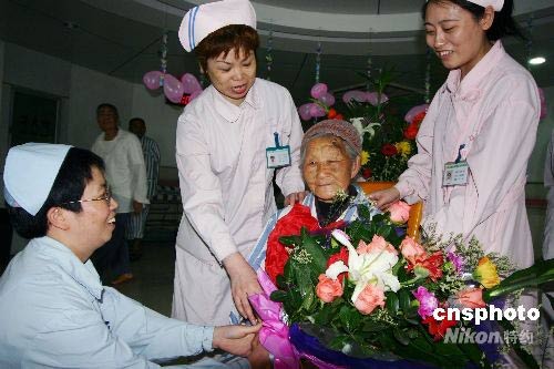 6月1日,四川北川縣災(zāi)區(qū)曲山鎮(zhèn)井夾山村99歲的杜銀珍老人在重慶市第二人民醫(yī)院十四病區(qū)醫(yī)務(wù)人員的精心打扮下,滿(mǎn)面笑容接受人們的百歲生日祝福。據(jù)了解,在5.12汶川大地震時(shí),杜銀珍老人背著重孫在廚房做飯,廚房垮塌后,強(qiáng)大的沖擊波將她一下推出5米多遠(yuǎn),摔到在院壩里。后在孫媳婦的攙扶下趕了10里山路才碰到救援部隊(duì),被送到綿陽(yáng)市中醫(yī)院。5月19日轉(zhuǎn)至重慶市第二人民醫(yī)院接受治療。中新社發(fā) 陳仕川 攝