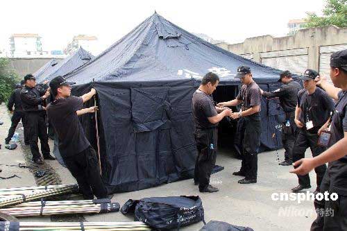 6月1日,經(jīng)過53小時(shí)日夜兼程到達(dá)四川綿陽集結(jié)地的福州市公安局特警支隊(duì)民警們迅速搭建宿營(yíng)地,為開使執(zhí)勤做好準(zhǔn)備。中新社發(fā) 常剛 攝