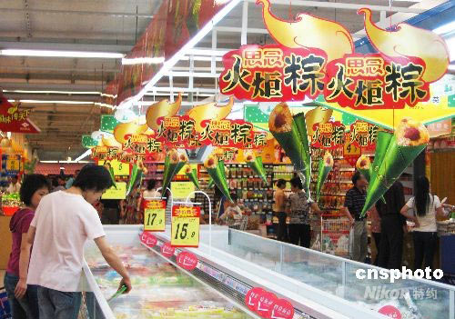 6月2日,廣西北海市一家超市應(yīng)即將到來的中國傳統(tǒng)節(jié)日端午節(jié)而推出奧運(yùn)“火炬粽”,其獨(dú)特的火炬造型和“祝福北京奧運(yùn)”的寓意,吸引了不少顧客選購。隨著2008北京奧運(yùn)會(huì)的臨近,商家紛紛借機(jī)推出具有奧運(yùn)元素的商品促銷。 中新社發(fā) 范靜 攝