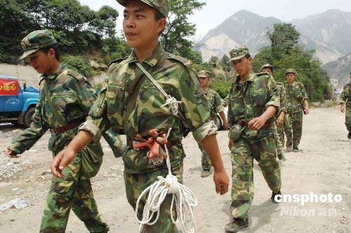 6月2日下午,多支解放軍部隊官兵調(diào)集四川映秀山區(qū),加大地面搜尋失事直升機力度。圖為一工兵部隊在連續(xù)搜尋數(shù)十個小時未果后進行“換防”。5月31日下午,成都軍區(qū)抗震救災部隊一架米-171運輸直升飛機在執(zhí)行運送第三軍醫(yī)大學防疫專家到理縣的任務返回途中,因局部氣候變化,突遇低云大霧和強氣流,于14時56分在汶川縣映秀鎮(zhèn)附近失事。中新社發(fā) 陳文 攝