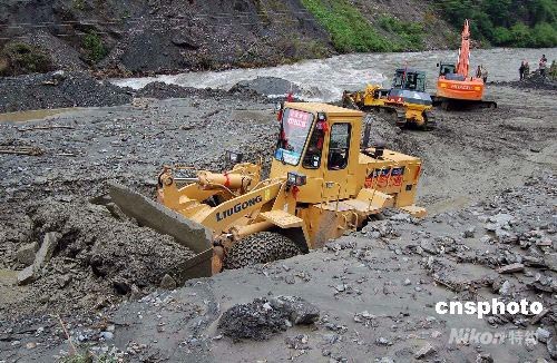 因近日連續(xù)暴雨,前不久剛剛搶通的5·12大地震重災(zāi)區(qū)臥龍至耿達(dá)的簡易公路多處被泥石流、坍方?jīng)_斷,武警交通直屬工程部緊急出動工程機械搶通。圖為裝載機在一處厚達(dá)3米多、寬近300米的泥石流堆積層上為后續(xù)機械開出一條通路。中新社發(fā) 江湖 攝