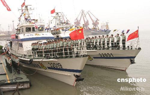 6月19日,江蘇公安邊防總隊海警支隊青島奧帆賽海上安保出征誓師大會舉行。蘇浙兩省公安邊防海警部隊共5艘艦艇參加“青島奧帆賽海上安全保衛(wèi)”工作,這支海警部隊的官兵大都參加過去年在青島舉行的“公安海警奧運海上安全保衛(wèi)反恐演習(xí)”,并經(jīng)過層層選拔,參加了數(shù)百次的夜航、艦艇禮儀、軍事技能等訓(xùn)練,并針對奧運海上安保過程中可能出現(xiàn)的各類突發(fā)事件進行了針對性訓(xùn)練和演練。 中新社發(fā) 王健民 攝