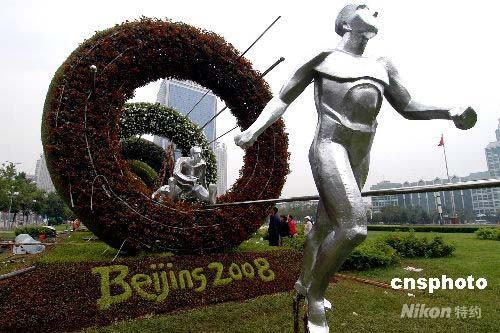 6月30日,沈陽市政府廣場西側的大型立體組合花壇雕塑《騰飛》完工。該雕塑是繼大型花壇雕塑《中國印》之后,綠化部門為了迎接奧運會又一大手筆。該雕塑高5米、長20米,用了萬余盆五色花卉裝點五環(huán)。雕塑表現(xiàn)了一名運動員正在跨越奧運五環(huán)的各個瞬間,生動形象、寓意深刻。 中新社發(fā) 文契 攝