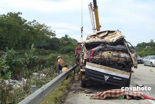 7月2日7時30分,GO5O國道廣西都南高速公路距離武鳴服務區(qū)五公里處,發(fā)生一起交通事故,造成一死一傷。一輛車牌號為川J22030的大貨車由都安開往南寧方向,在廣西都南高速公路距離武鳴服務區(qū)五公里處撞至公路護欄后沖出路外,翻下護坡,造成一人當場死亡。中新社發(fā) 黃艷梅 攝