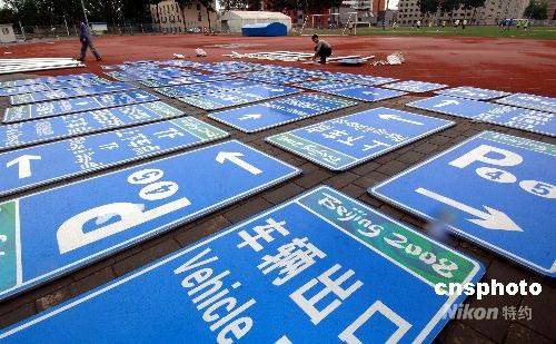 奧運(yùn)臨近,中國農(nóng)業(yè)大學(xué)摔跤館的工作人員正在緊張布置奧運(yùn)相關(guān)設(shè)施。距離北京奧運(yùn)會開幕僅剩一個多月的時間,許多奧運(yùn)場館正在有條不紊的進(jìn)行收尾工作。中新社發(fā) 王東明 攝