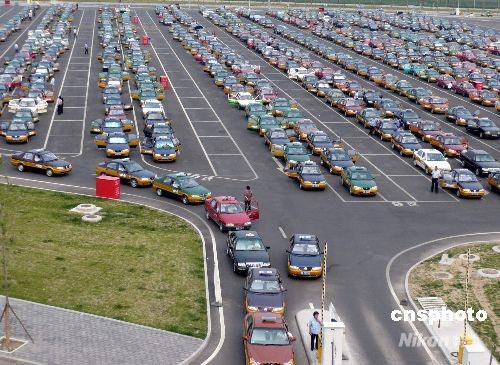 2008年7月6日,北京首都機(jī)場內(nèi)的出租車排成了長龍。據(jù)悉,北京將于2008年7月20日全面實(shí)行機(jī)動車單雙號限行。在此期間,北京市6.6萬輛出租車將保持95%以上的出車率,可日增加60萬人次運(yùn)力,達(dá)到每天248萬人次。 中新社發(fā) 樊甲山 攝