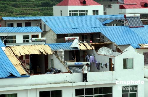 2008年7月7日晚,江西湖口縣部分地區(qū)遭遇龍卷風(fēng)襲擊,有一處兩間三層的新樓房屋頂被掀走。當(dāng)時(shí),居民在家中熟睡,蓋在身上的被子也被大風(fēng)卷走,幸未造成人員傷亡。中新社發(fā) 張 俊 攝