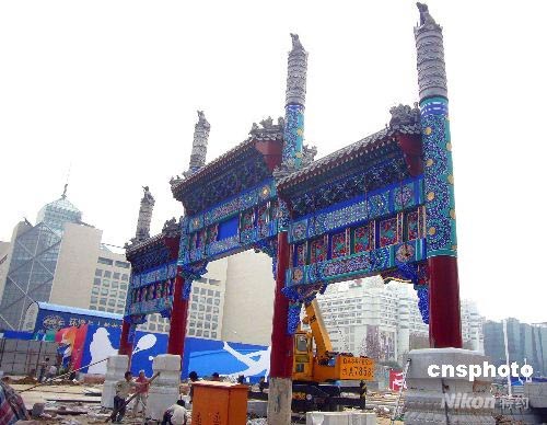 7月9日, 重新復(fù)建的明代西單牌樓在北京西單文化廣場(chǎng)初展“芳容”。歷時(shí)三個(gè)多月的北京西單文化廣場(chǎng)整治工程已接近尾聲,奧運(yùn)會(huì)前夕將全新亮相。中新社發(fā) 玉龍 攝