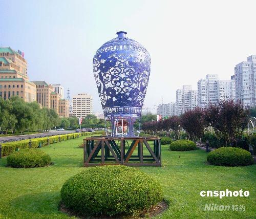 7月20日,一個高4米左右的“青花瓷”瓶奧運花壇在北京長安街亮相,其清新典雅的“芳姿”成為一道別致風景。中新社發(fā) 玉龍 攝