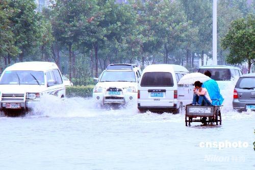 7月21日到23日,河南遭受本月第5次暴雨侵襲,降雨量約60毫米至100毫米,鄭州多處路段出現(xiàn)深度積水。圖為汽車在積水中艱難前行。中新社發(fā) 李冰 攝