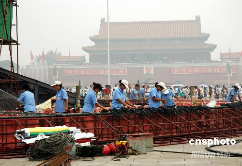 7月24日,北京天安門廣場(chǎng)中心花壇主景周圍擺放圓形花壇,并在花壇外圍布置低噴泉和彌霧裝置。整個(gè)廣場(chǎng)花壇都采用了夜景照明設(shè)計(jì),達(dá)到白天看花,晚上看燈的效果,F(xiàn)在整個(gè)工程正在緊張進(jìn)行,預(yù)計(jì)將于26日完工。中新社發(fā) 張雙雙 攝