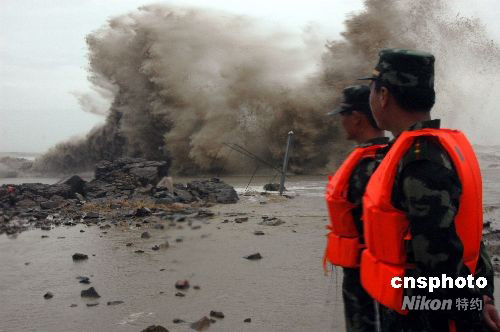 7月28日,洞頭邊防官兵在海邊巡邏,巨浪拍擊岸邊激起10多米高的浪花。當(dāng)日傍晚,受今年第8號臺風(fēng)“鳳凰”影響,浙江溫州市洞頭海域風(fēng)力大增,攔海大堤旁波濤洶涌,掀起巨浪達(dá)10多米高。洞頭邊防大隊迅速出動抗臺應(yīng)急分隊,加強海邊巡邏檢查,及時勸阻觀浪群眾撤離至安全地帶。中新社發(fā) 吳水斌 攝