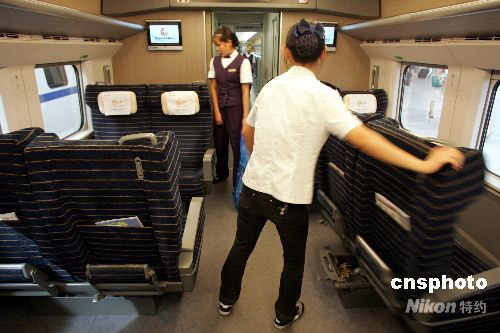 8月1日,城際高速鐵路列車(chē)員在列車(chē)到達(dá)北京南站時(shí),熟練的將車(chē)廂內(nèi)所有座椅180度轉(zhuǎn)向,以便隨后登車(chē)的北京旅客在旅途中一直面向列車(chē)前進(jìn)方向。