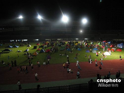 九月一日晚,上千名攀枝花市民在攀枝花體育場搭帳篷過夜。因害怕再次發(fā)生余震,許多市民從家里搬到了體育場內(nèi)。體育場已免費(fèi)向市民開放,并二十四小時提供熱水。中新社發(fā) 劉子倩 攝