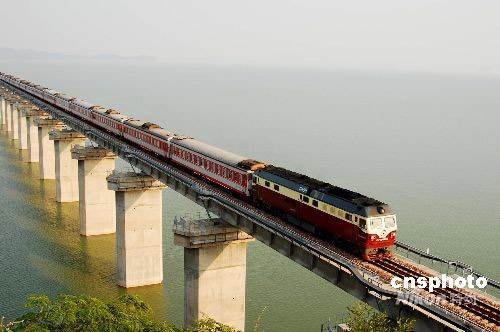 9月2日下午,一列客車從鄱陽湖鐵路特大橋上向九江駛?cè)。當天,旅客列車首次通過鄱陽湖。自9月1日起,銅九鐵路先后開行南昌至南京、南昌至寧波、南京至武昌等方向旅客列車,江西境內(nèi)湖口、彭澤2個縣城從此結(jié)束不通旅客列車的歷史。據(jù)了解,客車開行后,從九江至南京比目前縮短近10個小時,從南昌至南京也比目前縮短近5個小時,南昌至寧波需繞道杭州的歷史結(jié)束,旅客出行更加方便、快捷。圖為9月2日16:45分左右,K506次南京至南昌旅客列車從鄱陽湖鐵路特大橋上駛過。中新社發(fā) 胡國林 攝