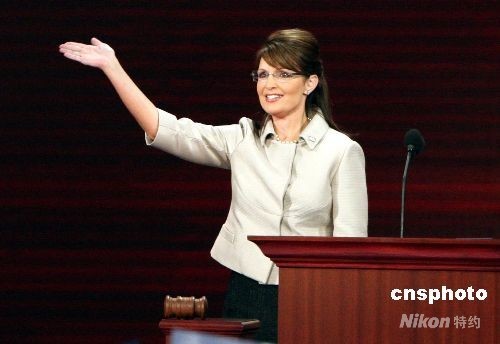 美國阿拉斯加州州長薩拉·佩林,九月三日在明尼蘇達州州府圣保羅舉行的共和黨全國代表大會上發(fā)表接受提名演說,成為共和黨歷史上首位女副總統(tǒng)候選人。中新社發(fā) 李靜 攝