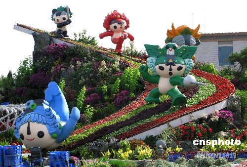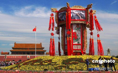 9月25日,北京天安門廣場“普天同慶”繁花錦簇的十一國慶花壇布置工程進入了最后收尾階段。廣場東側(cè)的5個福娃花壇與中央9.9米高的民族傳統(tǒng)宮燈花壇相映成趣。中新社發(fā) 鄒憲 攝