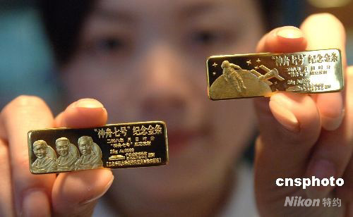 9月26日,為紀念“神舟七號”飛船發(fā)射成功,由中國國家博物館藝術品開發(fā)中心監(jiān)制的“神舟七號”紀念金條在北京上市發(fā)行,發(fā)行前已獲得翟志剛、劉伯明和景海鵬三位宇航員的肖像授權和簽名。國內(nèi)發(fā)行量限定為3000套,每套包括兩根25克AU9999金條。第一根金條雕鑄有“神舟七號”在太空的遨游圖和宇航員出艙圖;第二根金條正面雕鑄有三名宇航員的肖像。 中新社發(fā) 鄒憲 攝