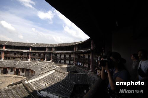 9月26日,游客在漳州華安“二宜樓”里游覽參觀。福建土樓群“申遺”成功后,前來旅游觀光的國內(nèi)外游客絡繹不絕。中新社發(fā) 王東明 攝