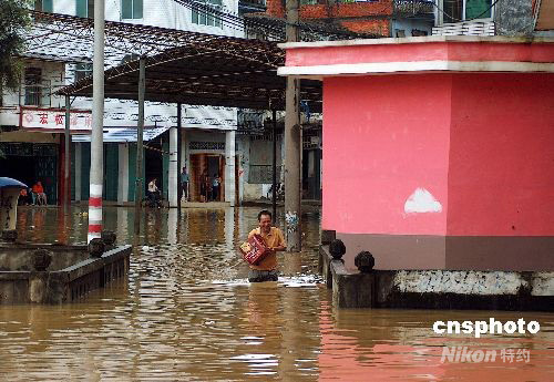 受“黑格比”影響,地處中越邊境的廣西龍州縣受來自越南水口河、平兒河兩河水暴漲影響,9月26日左江龍州水文站水位達(dá)116.21米,并以每小時0.52米的速度上漲。至當(dāng)天下午18點,水位已達(dá)120.01米,造成龍州縣城的青龍橋、合龍街、白沙街、利民街等部分低洼地段民房、商鋪受淹。由于預(yù)防措施到位,及時轉(zhuǎn)移物品,損失不大。但沿江的上金鄉(xiāng)農(nóng)作物部分受淹。沒有人員傷亡報告。圖為青龍橋路段受淹,居民在趟水搶救物品。中新社發(fā) 馮文 攝