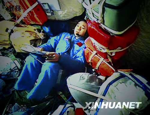 9月27日,航天員景海鵬在神舟七號載人飛船返回艙與地面通話(攝于北京航天飛行控制中心大屏幕)。當(dāng)日中午,航天員出艙活動任務(wù)開始。新華社記者查春明攝